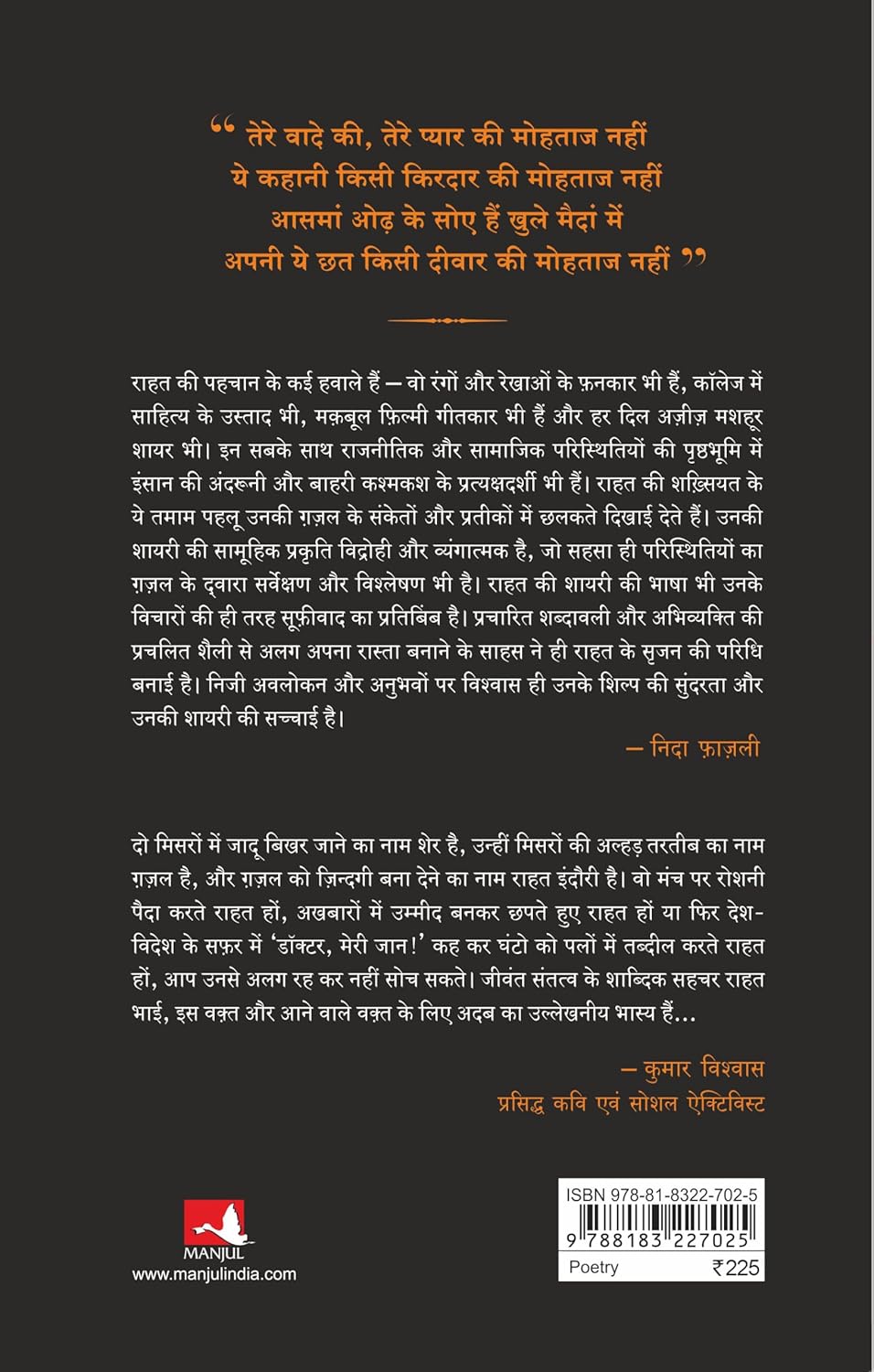 नाराज़ राहत इंदौरी राहत की पहचान के कई हवाले हैं – वो रंगों और रेखाओं के फ़नकार भी हैं, कॉलेज में साहित्य के उस्ताद भी, मक़बूल फ़िल्मी गीतकार भी हैं और हर दिल अज़ीज़ मशहूर शायर भी I इन सबके साथ राजनीतिक और सामाजिक परिस्थितियों की पृष्ठभूमि में इंसान की अंदरुनी और बाहरी कश्मकश के प्रत्यक्षदर्शी भी हैं I राहत की शख़्सियत के ये तमाम पहलू उनकी ग़ज़ल के द्वारा सर्वेक्षण और विश्लेषण भी है I राहत की शायरी की भाषा भी उनके विचारों की ही तरह सूफ़ीवाद का प्रतिबिंब है I प्रचारित शब्दावली और अभिव्यक्ति की प्रचलित शैली से अलग अपना रास्ता बनाने के साहस ने ही राहत के सृजन की परिधि बनाई है I निजी अवलोकन और अनुभवों पर विश्वास ही उनके शिल्प की सुंदरता और उनकी शायरी की सच्चाई है I – निदा फ़ाज़ली