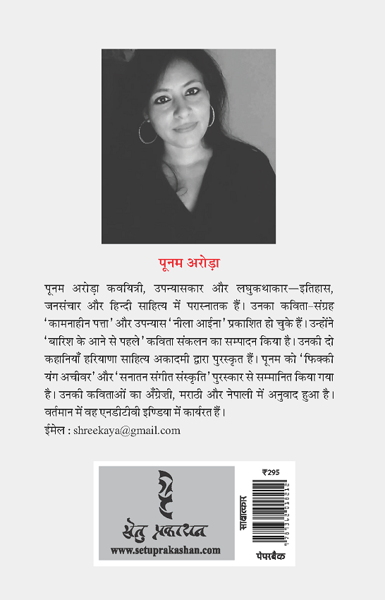 पूनम अरोड़ा पूनम अरोड़ा कवयित्री, उपन्यासकार और लघुकथाकार- इतिहास, जनसंचार और हिन्दी साहित्य में परास्नातक हैं। उनका कविता संग्रह ‘कामनाहीन पत्ता’ और उपन्यास ‘नीला आईना’ प्रकाशित हो चुके हैं। उन्होंने ‘बारिश के आने से पहले’ कविता संकलन का सम्पादन किया है। उनकी दो कहानियाँ हरियाणा साहित्य अकादमी द्वारा पुरस्कृत हैं। पूनम को ‘फिक्की यंग अचीवर’ और ‘सनातन संगीत संस्कृति’ पुरस्कार से सम्मानित किया गया है। उनकी कविताओं का अँग्रेजी, मराठी और नेपाली में अनुवाद हुआ है। वर्तमान में वह एनडीटीवी इण्डिया में कार्यरत हैं।