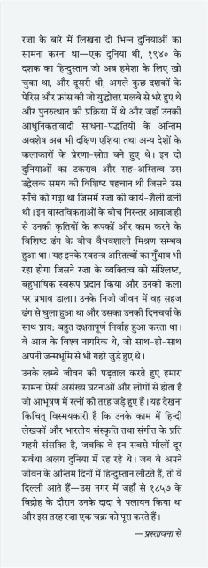सैयद हैदर रज़ा जैसे आधुनिक मूर्धन्य के बारे में, उनके जीवन और कला संघर्ष के बारे में जानने की जिज्ञासा बहुतों को होती रही है। कला-विदुषी यशोधरा डालमिया ने यह सुशोभित जीवनी लिखी है और उसका यह हिन्दी अनुवाद, आलोचक और कला-प्रेमी, मदन सोनी ने किया है। यह मात्र जीवनी नहीं है बल्कि रज़ा साहब की कला यात्रा का कलालोचक की दृष्टि से विवेचन भी है।