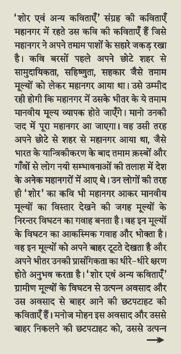 ‘शोर एवं अन्य कविताएँ’ संग्रह की कविताएँ महानगर में रहते उस कवि की कविताएँ हैं जिसे महानगर ने अपने तमाम पाशों के सहारे जकड़ रखा है। कवि बरसों पहले अपने छोटे शहर से सामुदायिकता, सहिष्णुता, सहकार जैसे तमाम मूल्यों को लेकर महानगर आया था। उसे उम्मीद रही होगी कि महानगर में उसके भीतर के ये तमाम मानवीय मूल्य व्यापक होते जाएँगे। मानो उनकी ज़द में पूरा महानगर आ जाएगा। वह उसी तरह अपने छोटे से शहर से महानगर आया था, जैसे भारत के यान्त्रिकीकरण के बाद तमाम क़स्बों और गाँवों से लोग नयी सम्भावनाओं की तलाश में देश के अनेक महानगरों में आए थे। उन लोगों की तरह ही ‘शोर’ का कवि भी महानगर आकर मानवीय मूल्यों का विस्तार देखने की जगह मूल्यों के निरन्तर विघटन का गवाह बनता है। वह इन मूल्यों के विघटन का आकस्मिक गवाह और भोक्ता है। वह इन मूल्यों को अपने बाहर टूटते देखता है और अपने भीतर उनकी प्रासंगिकता का धीरे-धीरे क्षरण होते अनुभव करता है। ‘शोर एवं अन्य कविताएँ’ ग्रामीण मूल्यों के विघटन से उत्पन्न अवसाद और उस अवसाद से बाहर आने की छटपटाहट की कविताएँ हैं। मनोज मोहन इस अवसाद और उससे बाहर निकलने की छटपटाहट को, उससे उत्पन्न हुई चीख को पूरे धीरज के साथ अपने भीतर लम्बे समय तक धारण किये रहते हैं और तब जाकर कविताएँ लिखते हैं। शायद हम यह कह सकते हैं ये कविताएँ धीरज के सरोवर में उगे चीख के फूलों की तरह हमारे सामने आयी हैं। हम इनमें अपनी सभ्यता के सामुदायिकता, सहिष्णुता, सहकार जैसे तमाम मूल्यों की रोशनी में भारत के महानगरों की सच्चाई को धीरे-धीरे खुलते हुए देखते हैं। इन्हीं मूल्यों की रोशनी में हमें आधुनिक भारतीय जीवन के परम पराभव के जब दर्शन होते हैं, हम खुद से प्रश्न करने को मजबूर हो उठते हैं। कविताओं के इस संग्रह को हम महानगरों में पारम्परिक मूल्यों और क़स्बों-गाँवों से आए नवयुवकों की जीवनगाथा के रूप में भी पढ़ सकते हैं और पढ़कर यह जान सकते हैं कि जिन महानगरों को हमने उम्मीद के स्थापत्य की तरह खड़ा किया था वे हमारे देखते-देखते ही किस तरह उम्मीदों को नष्ट करने वाली मशीनों में तब्दील हो गये हैं।