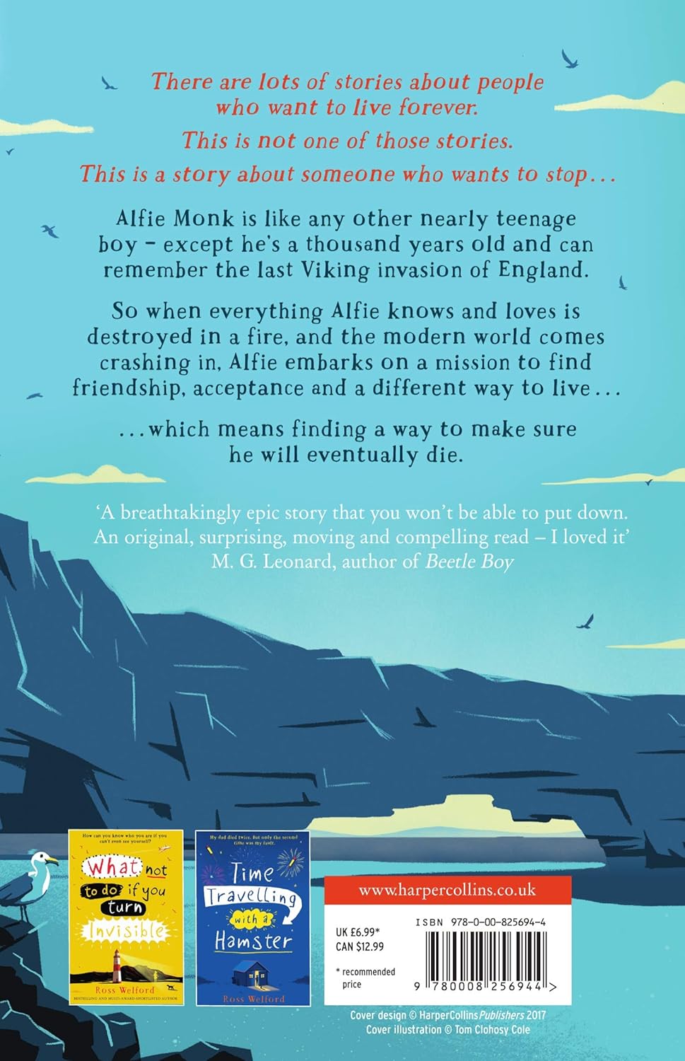 ‘A wonderful story’ Kiran Millwood Hargrave. There are stories about people who want to live forever. This is not one of those stories. This is a story about someone who wants to stop. Alfie Monk is like any other nearly teenage boy except hes 1,000 years old and can remember the last Viking invasion of England. Obviously no one believes him. So when everything Alfie knows and loves is destroyed in a fire and the modern world comes crashing in, Alfie embarks on a mission to find friendship, acceptance and a different way to live.
