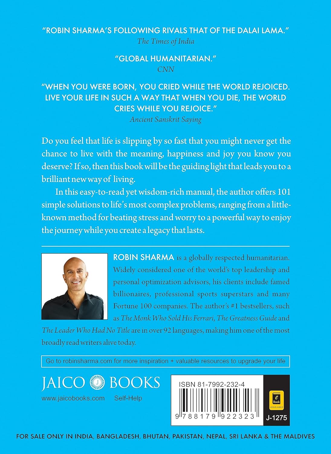 Life Lessons From The Monk Who Sold His Ferrari Do You Feel that life is slipping by so fast that you might never get the chance to live with the meaning, happiness and joy you know you deserve? If so, then this book will be the guiding light that leads you to a brilliant new way of living. In this easy-to-read yet wisdom-rich manual, the author offers 101 simple solutions to life’s most complex problems, ranging from a little-known method for beating stress and worry to a powerful way to enjoy the journey while you create a legacy that lasts. “When You Were Born, You Cried While The World Rejoiced. Live Your Life In Such A Way That When You Die, The World Cries While You Rejoice.”